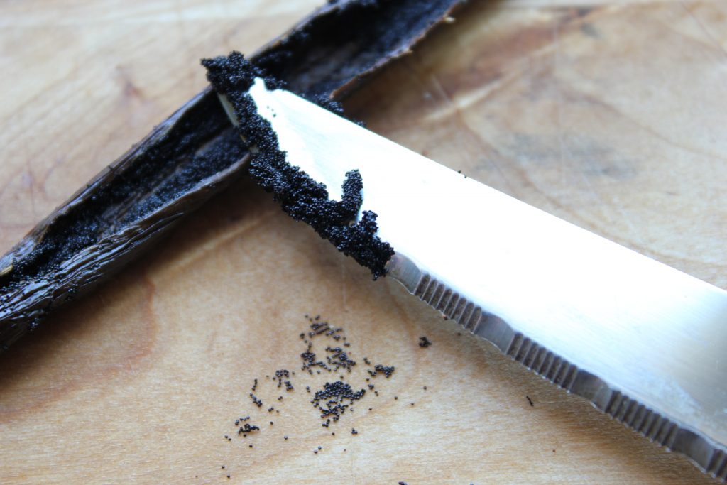 - Split the vanilla bean and scrape the vanilla bean seeds from the pod.
