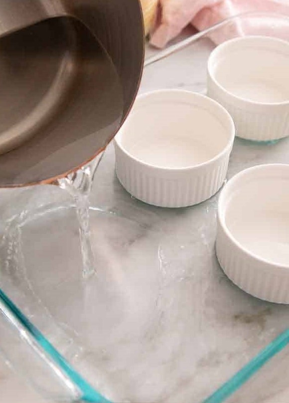8. Place the ramekins into a baking dish, and fills the baking dish with very hot water.